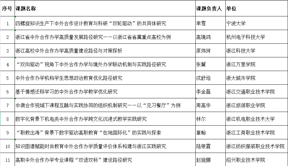 为加强高校中外合作办学理论与实践研究,助力中外合作办学高水平发展,扎实推进浙江省中外合作办学高质量发展改革创新试验区建设,浙江省中外合作办学研究中心组织开展2025年度课题申报工作。本次申报共收到省内15所高校的20份申请,经个人申报、单位推荐、专家评审、网上公示等程序,共有11项课题成功立项为浙江省教育国际交流协会2025年度课题。具体立项课题如下表所示(排名不分先后)。