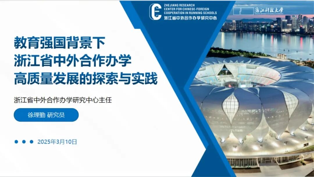 随后,徐理勤老师介绍了浙江省中外合作办学的基本情况,并通过大量的调研数据和丰富的优秀案例从六个方面阐述了浙江省中外合作办学高质量发展的探索与实践,即:中外合作办学提高人才培养质量、中外合作办学提升学科建设水平、中外合作办学助推高水平国际科研合作、中外合作办学助力人才高地建设、中外合作办学促进国际交流与合作、中外合作办学推进国际传播。最后,徐理勤老师分析了浙江省中外合作办学高质量发展改革创新试验区建设提出的具体背景,解读了试验区实施方案的主要内容,并从加快构建多层次特色化中外合作办学体系、引进培育高水平中外合作办学机构、强化全过程监督和指导、打造人才培养与科研合作“双轮驱动”浙江模式、加快人才高地建设、推进中外人文交流、建立帮扶机制、成立中外合作办学联盟等方面介绍了试验区建设启动以来浙江省为推进中外合作办学高质量发展所作的努力与尝试。